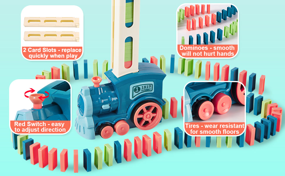 Simply load dominoes into the card clip, attach it to the train, and watch as the train moves forward while twisting left and right, placing dominoes in a perfect line for you. No setup hassle, just pure fun!