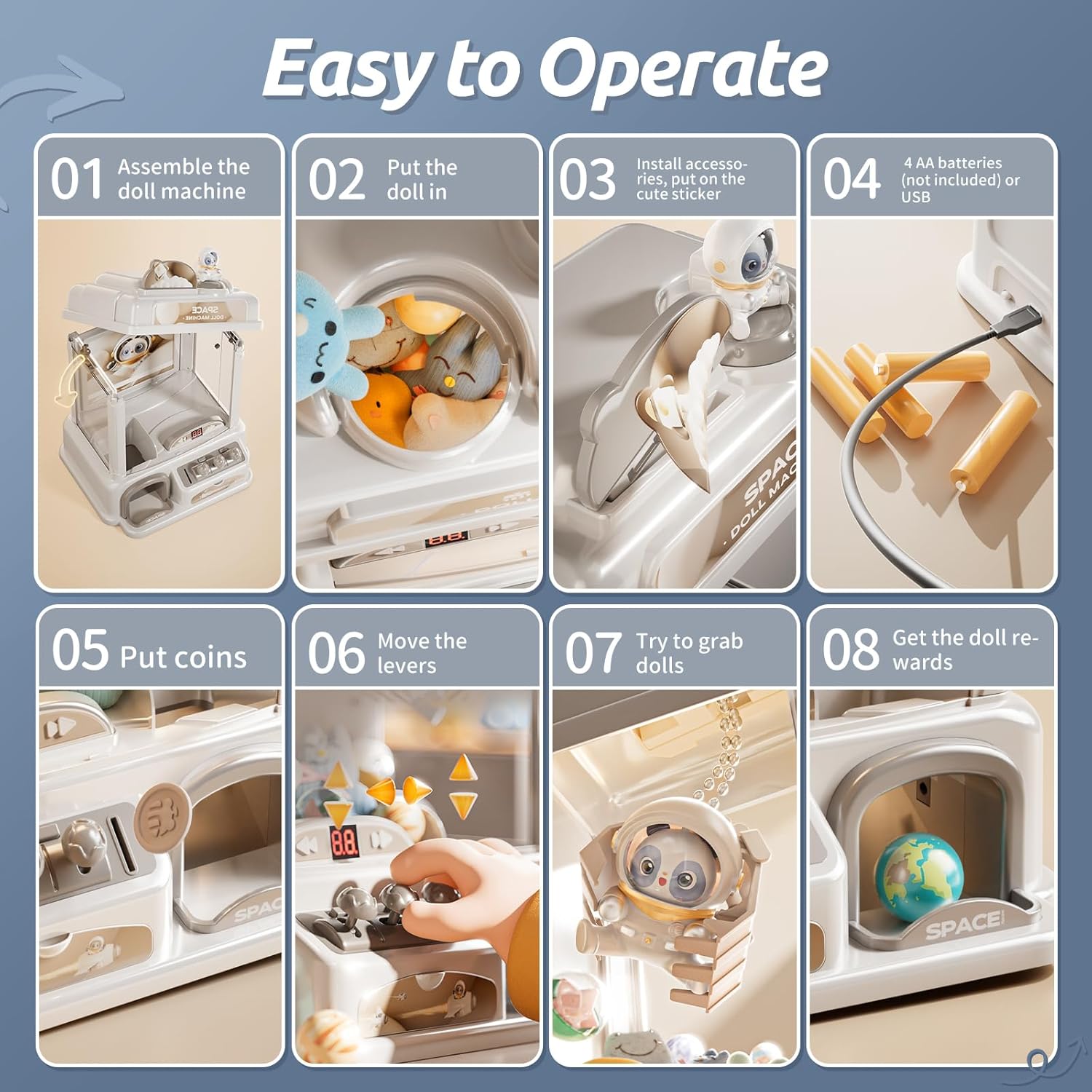 - Move the claw up, down, left, right, or spin it 360° to grab your prize.